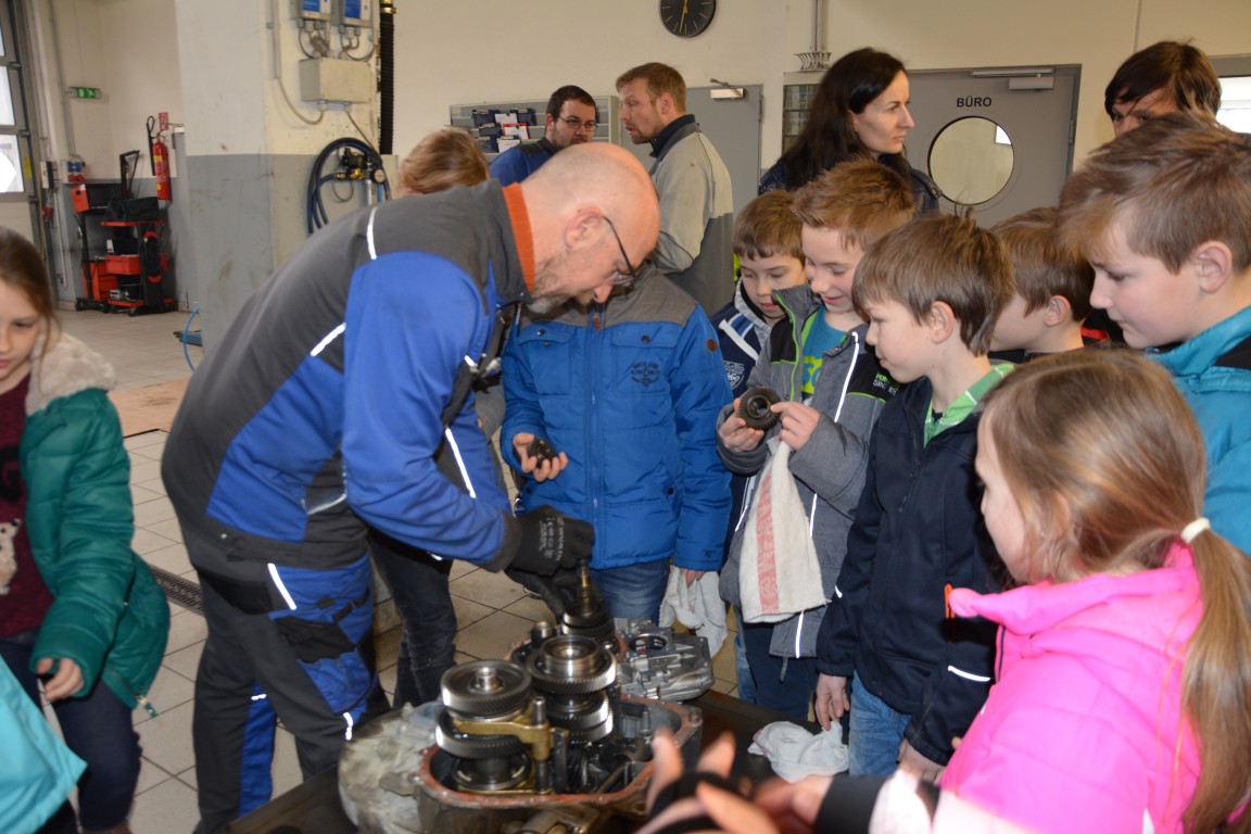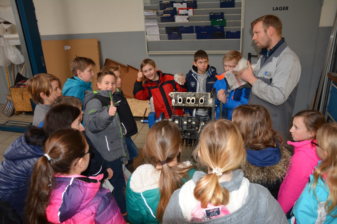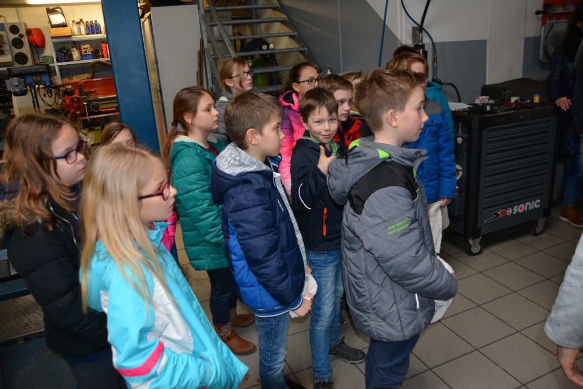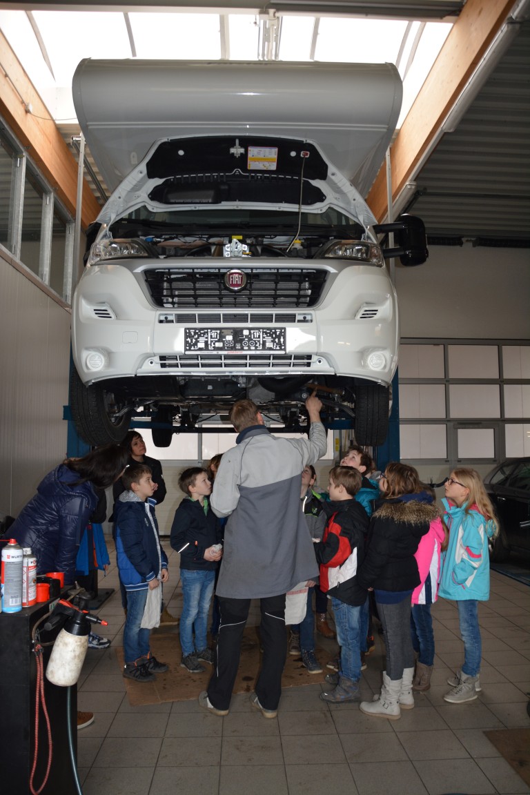 15. März 2018Am 15. März – in der Werkstunde – gingen die 4.Klassler der Jami – Klasse zu Fuß zum Autohaus Picheslberger. Als wir dort nach einer halben Stunde ankamen, stärkten wir uns mit ein paar Süßigkeiten. Florians Mama Rita führte uns danach in die Werkstatt. Dort begrüßte uns auch sein Papa Andreas. Zuerst zeigte er uns ein Wohnmobil, das mit der Hebebühne hochgehoben worden war. So konnten wir direkt unter das Fahrzeug schauen. Danach gingen wir um die Ecke, wo Manfred – der Opa von Florian – gerade ein Auto mit dem Schweißgerät reparierte. Ein paar Minuten später führte Andreas uns zu einem Auto, bei dem die Motorhaube offen war und man direkt den Ottomotor sah. Ein Mitarbeiter zeigte uns bei einem anderen Auto die zwei Bremsklötze und wir durften selbst mal Hand anlegen und die Bremsklötze möglichst fest andrücken, sodass sich das Rad nicht mehr drehen konnte. Der Lehrling Gabriel zeigte uns wie man einen Reifen flickt. Bei der nächsten Station zeigte uns Florians Papa bei einem ausgebauten Motor die Zylinder. Zum Schluss wurde uns noch ein Getriebe gezeigt. Jeder von uns durfte ein Getriebeteil in der Hand halten. Kurz darauf gingen wir in die Schule zurück.