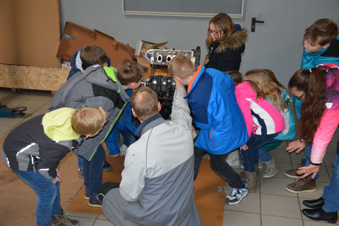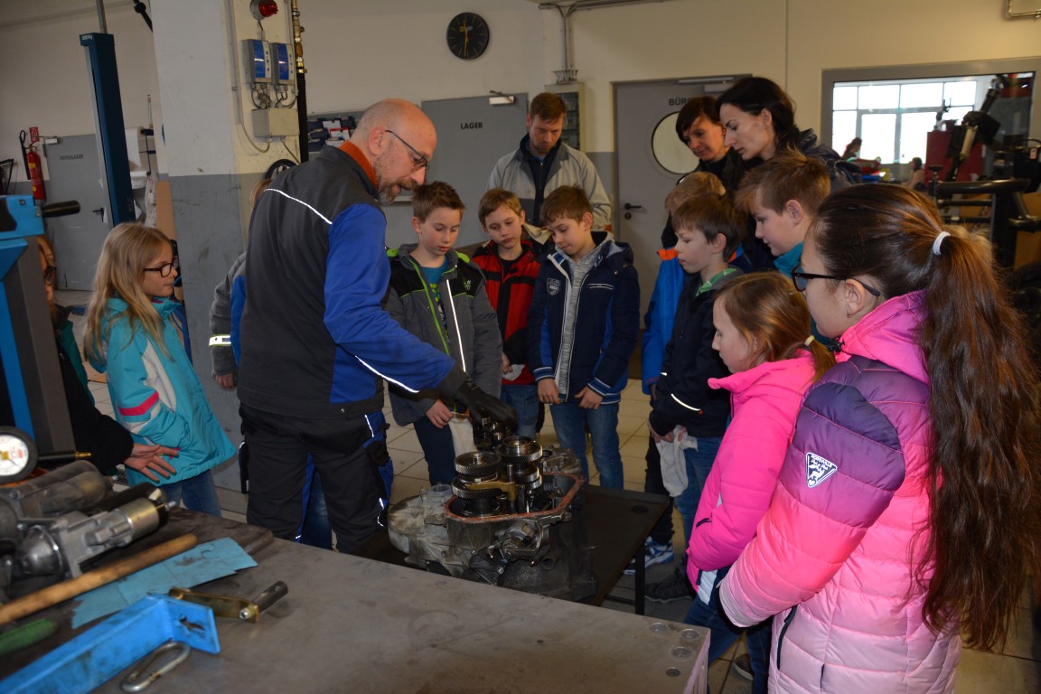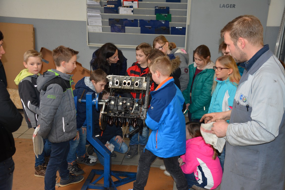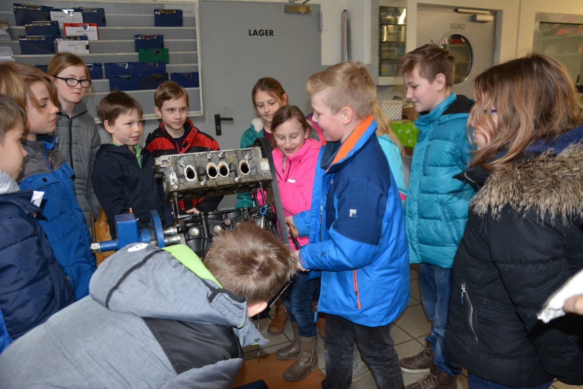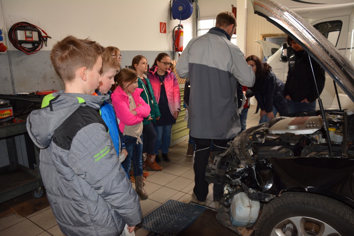 15. März 2018Am 15. März – in der Werkstunde – gingen die 4.Klassler der Jami – Klasse zu Fuß zum Autohaus Picheslberger. Als wir dort nach einer halben Stunde ankamen, stärkten wir uns mit ein paar Süßigkeiten. Florians Mama Rita führte uns danach in die Werkstatt. Dort begrüßte uns auch sein Papa Andreas. Zuerst zeigte er uns ein Wohnmobil, das mit der Hebebühne hochgehoben worden war. So konnten wir direkt unter das Fahrzeug schauen. Danach gingen wir um die Ecke, wo Manfred – der Opa von Florian – gerade ein Auto mit dem Schweißgerät reparierte. Ein paar Minuten später führte Andreas uns zu einem Auto, bei dem die Motorhaube offen war und man direkt den Ottomotor sah. Ein Mitarbeiter zeigte uns bei einem anderen Auto die zwei Bremsklötze und wir durften selbst mal Hand anlegen und die Bremsklötze möglichst fest andrücken, sodass sich das Rad nicht mehr drehen konnte. Der Lehrling Gabriel zeigte uns wie man einen Reifen flickt. Bei der nächsten Station zeigte uns Florians Papa bei einem ausgebauten Motor die Zylinder. Zum Schluss wurde uns noch ein Getriebe gezeigt. Jeder von uns durfte ein Getriebeteil in der Hand halten. Kurz darauf gingen wir in die Schule zurück.