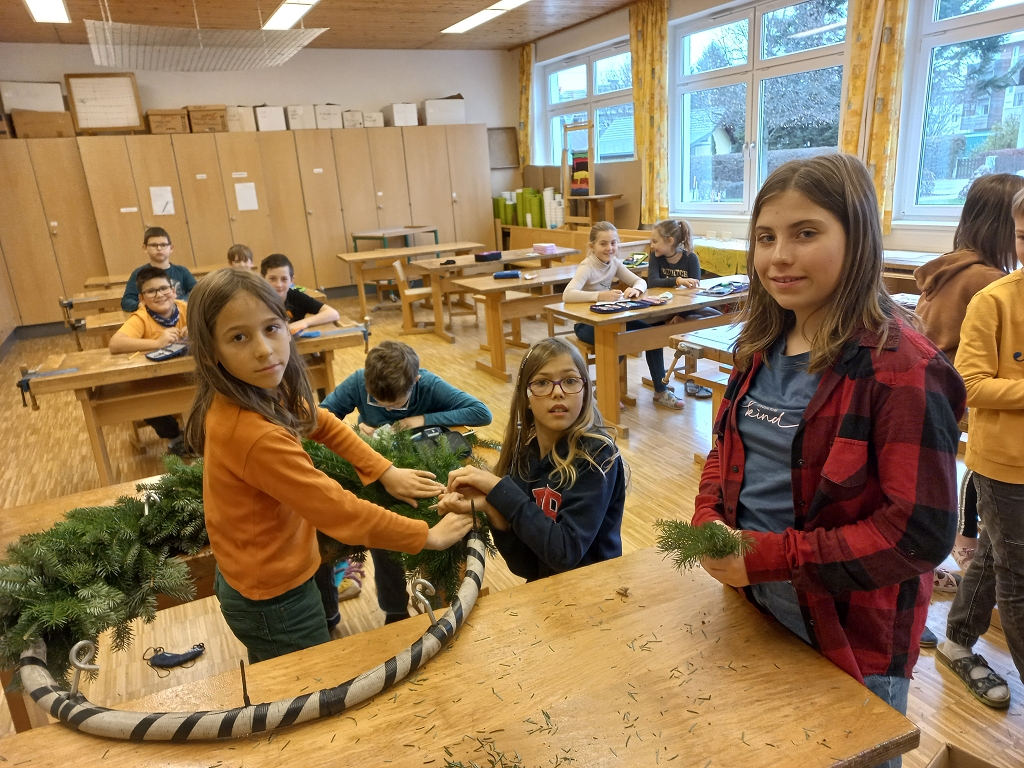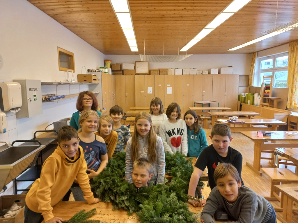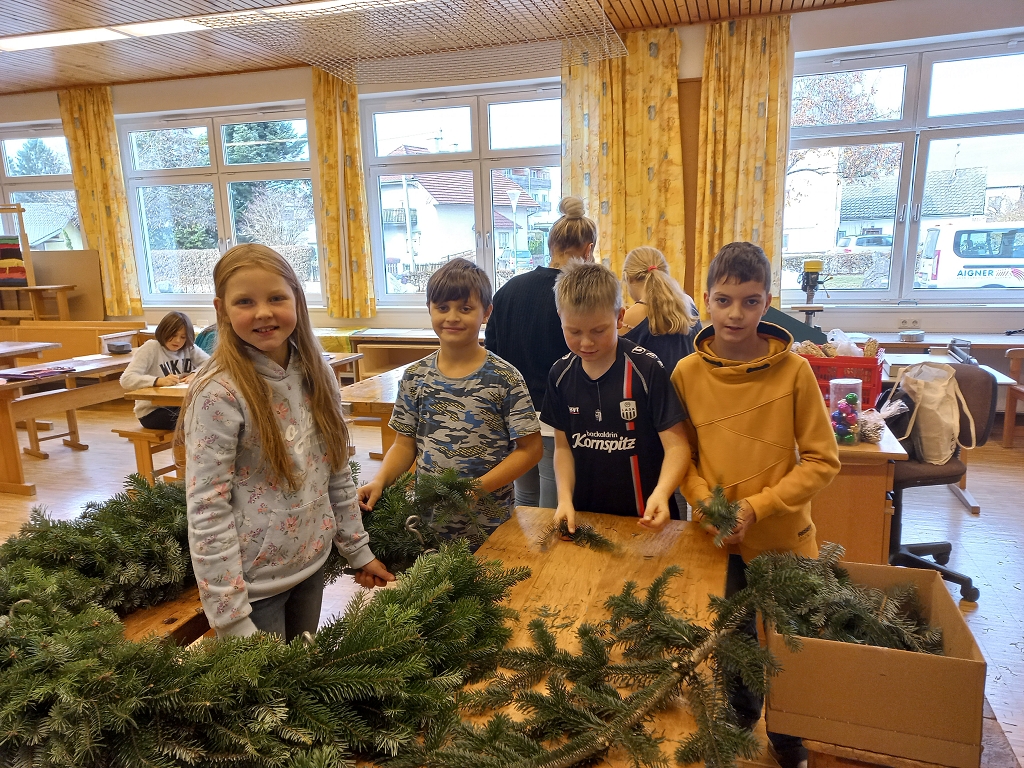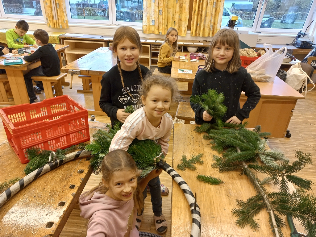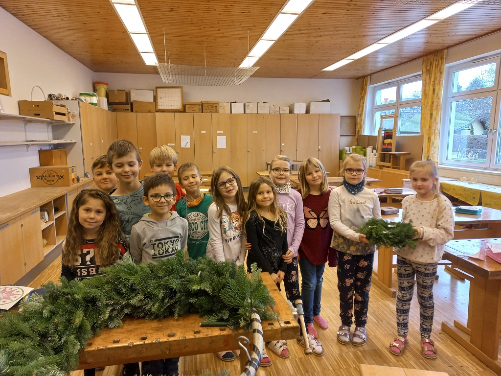 7. Dezember 2021Das jährliche Adventkranzbinden und -segnen ist an der VS Vorchdorf schon Tradition. Gemeinsam mit den Religionslehrerinnen, vorrangig mit Frau Ingrid Veress binden die Kinder wunderbare grüne Kränze. Ein großer Kranz, geschmückt mit vier Kerzen und Bändern bereichert das Stiegenhaus der Volksschule. Kleine grüne Kränze wurden zu Klassen-Adventkränzen umgestaltet. Gesegnet wurden die geschmückten Kränze heuer dann allesamt in der Schule.