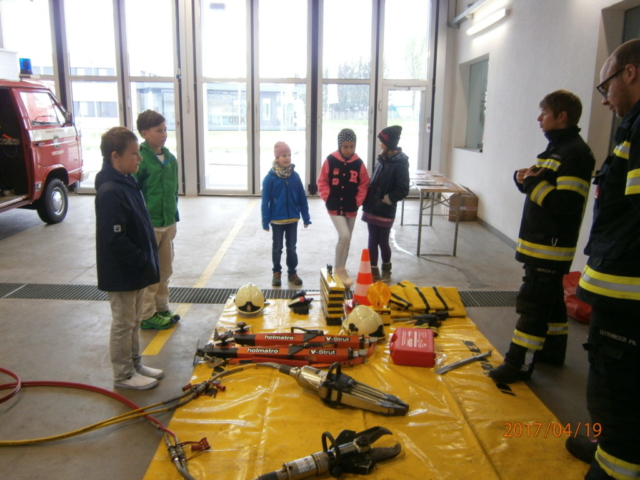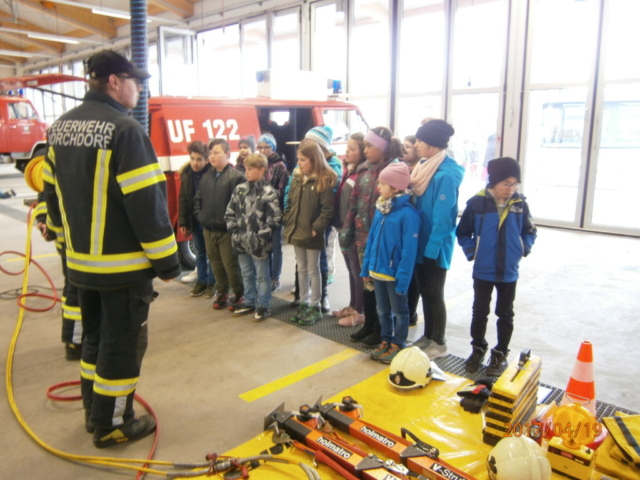 Michael Eisenführer zeigt den 4. Klassen die Feuerwehr Vorchdorf
