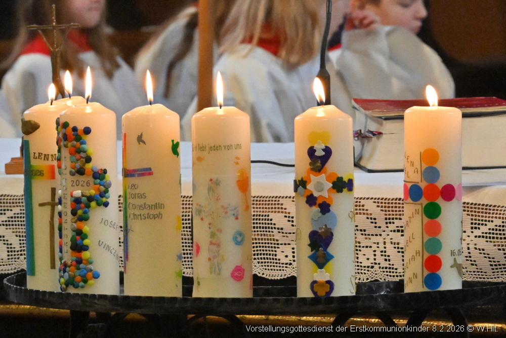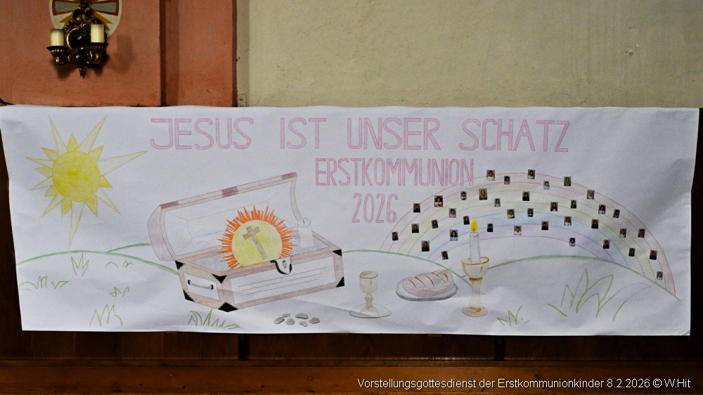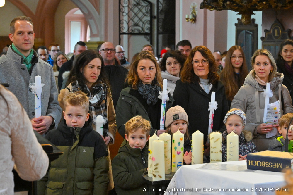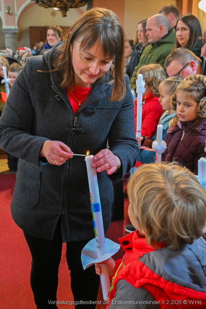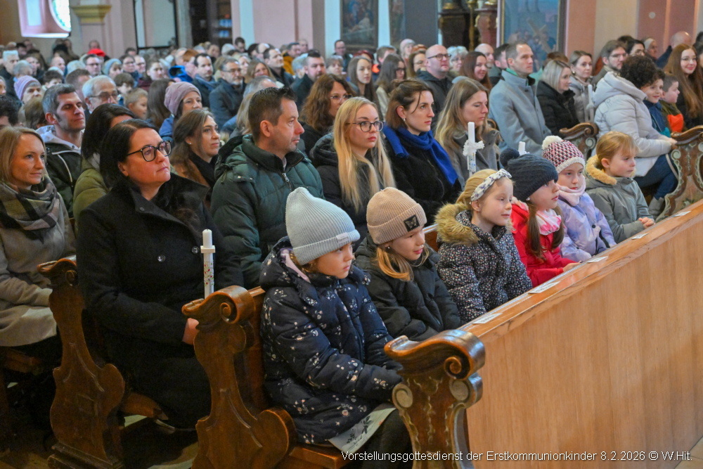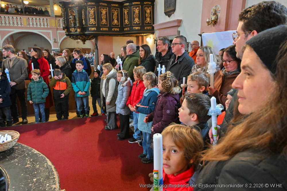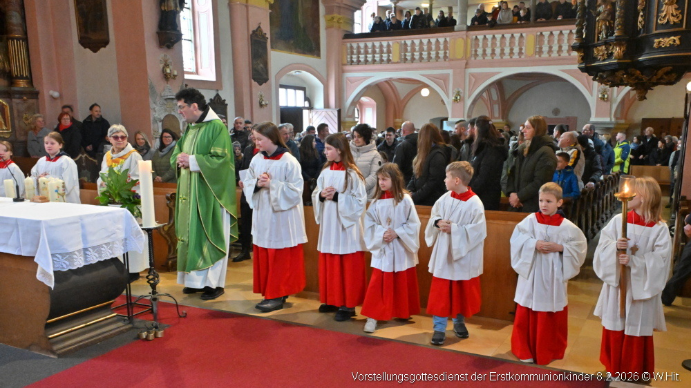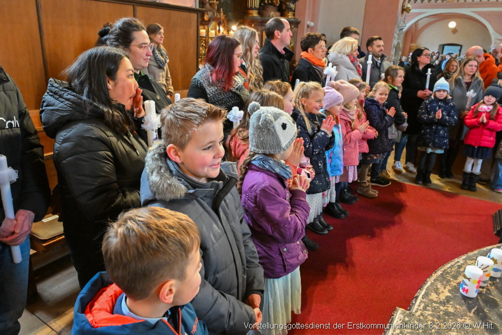 Beim Vorstellgottesdienst am 8. Februar 2026 zogen die Taufpaten gemeinsam mit den 37 Erstkommunionkindern ein und stellten sich rund um den Altar.